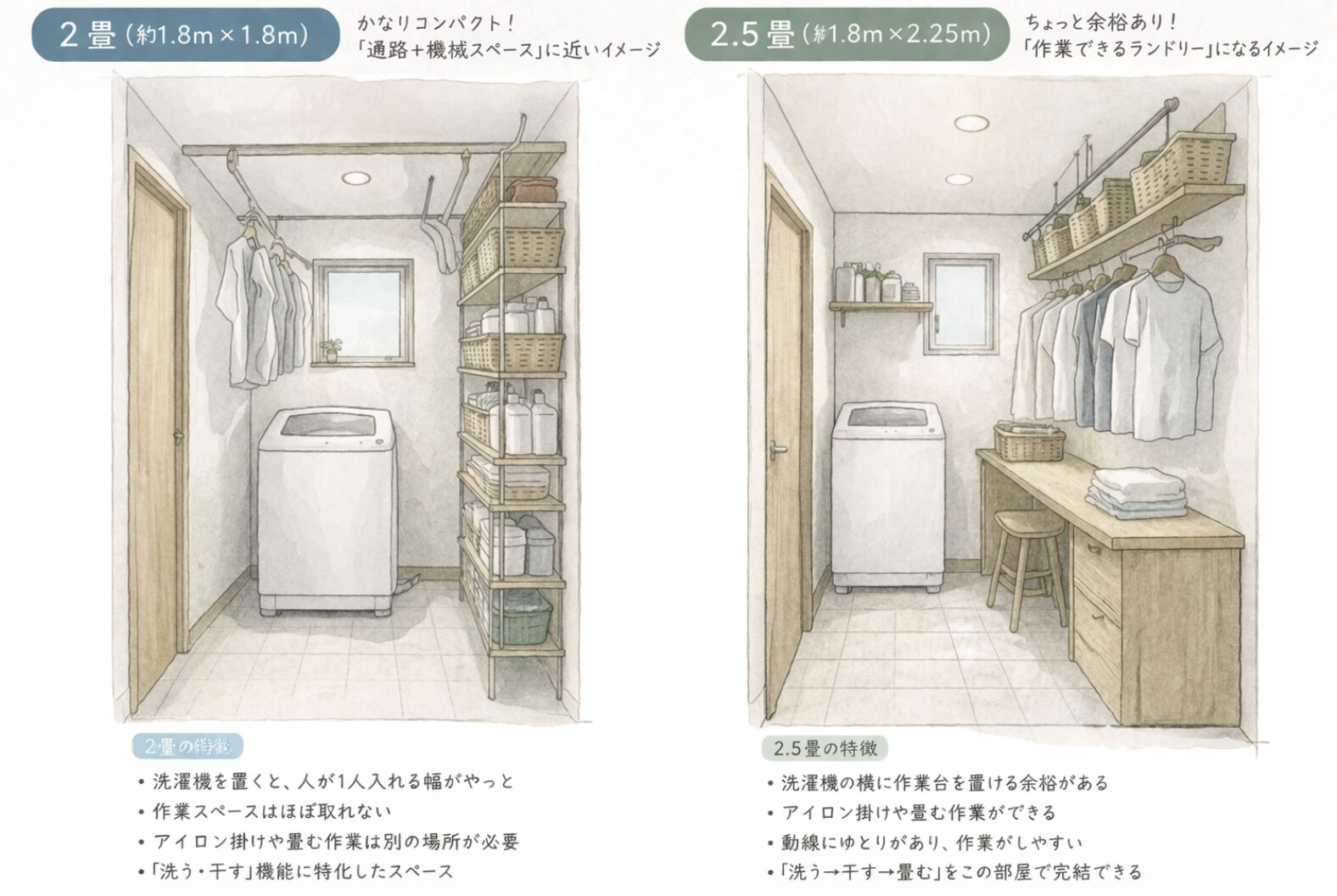 ただし、アイロン掛けや衣類を畳むスペースを設ける場合、2.5畳程度が望ましいケースもあります。」