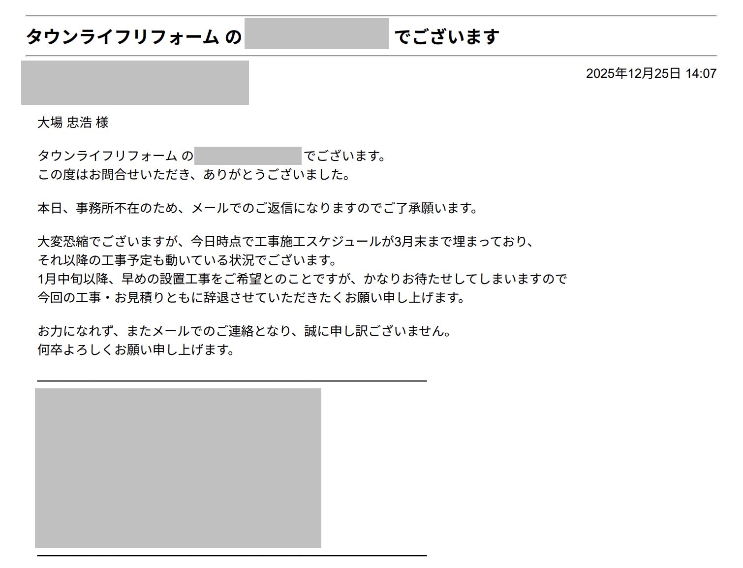 業者さんA(工事の時期を希望と合わせられないため辞退のご連絡)